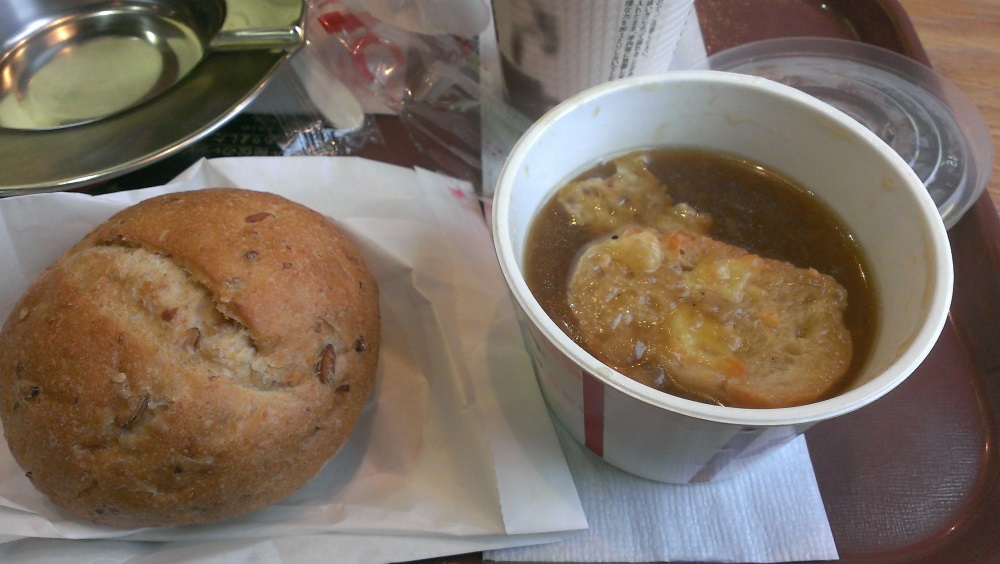 KFCでたいていポテトとビスケット、そしてコーヒーというセットしか頼まないのですが、今日は珍しくオニオングラタンスープと六穀パンという組み合わせを注文してみました。これも11月1日からのメニューです。クリスマスに向けて、オニオングラタンスープが売れるのでしょうか・・・?よくわかりませんが、ポテト&ビスケットの組み合わせよりは雑穀のパンのたまねぎスープのほうが体にはよさそうです。