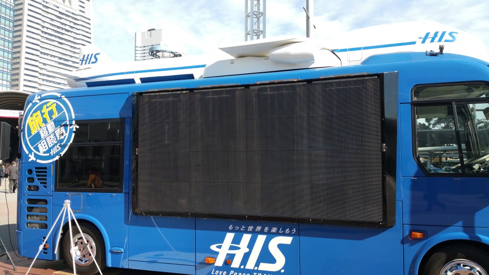 みなとみらいの駅前広場に、初めて旅行会社HISのトラックが停車していました。