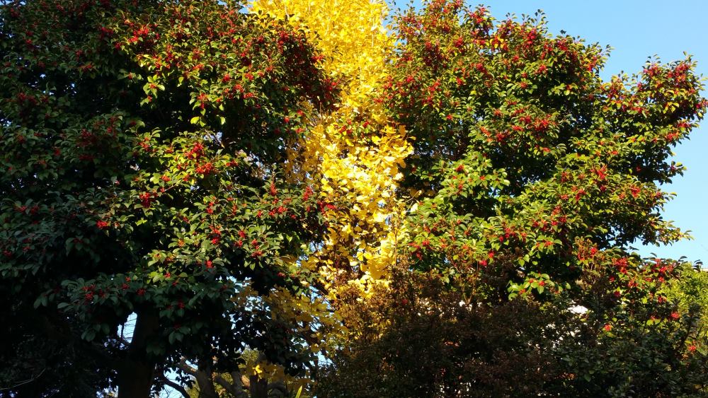この赤い実がなっている木の間からイチョウが見えています。