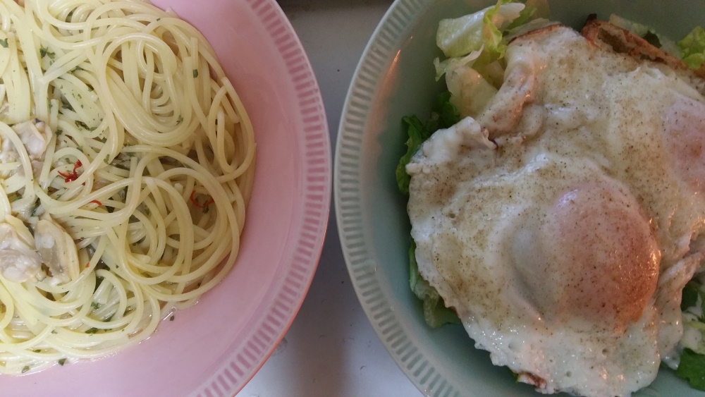 最近作っているのがコレ、ボンゴレビアンコと目玉焼きの乗ったサラダです。