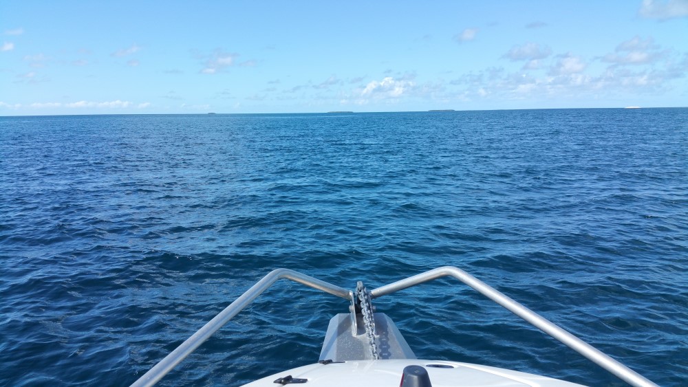 海がまだらになっているのが見えると思いますが、これが珊瑚礁です。この上を、どんな船及びボートも航行することはできません。