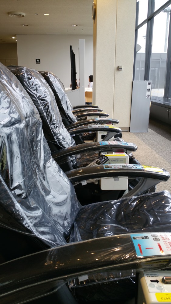 100円玉で動くタイプのマッサージチェアのために、私はわざわざ小銭を多く作っておき、20分間しっかり体をほぐしました。
