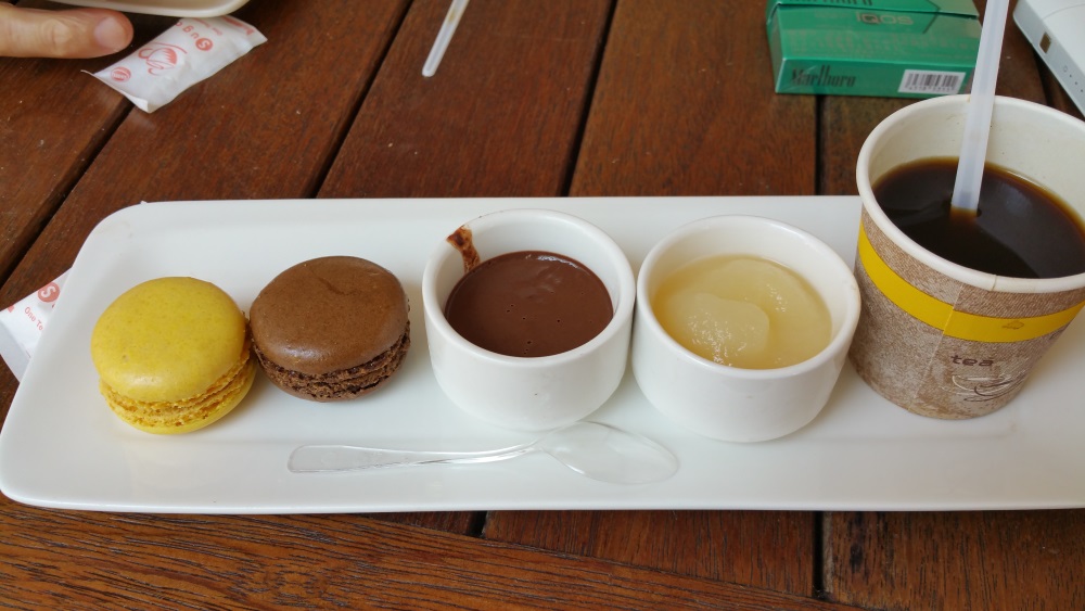 今回はご覧のマカロン2種とチョコムース、それにアップルコンフィズリーが出てきました。