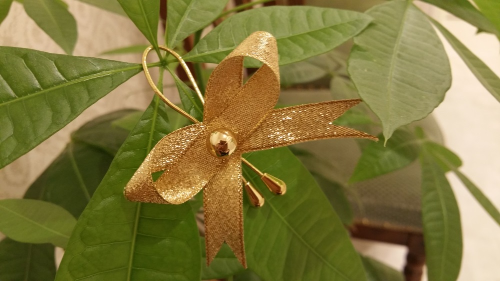 待合室のところに、誰かがかわいいいたずらをしたようで、葉っぱに金色のリボンがぶら下がっていました。