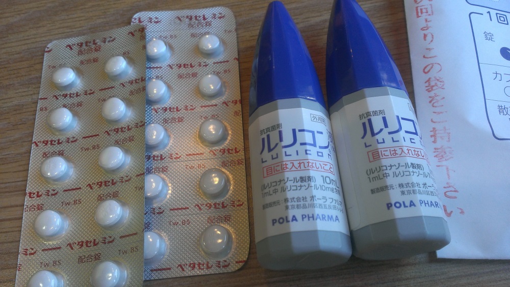 左の飲み薬「ベタセレミン」、右は頭皮に塗るローション「ルリコン」です。