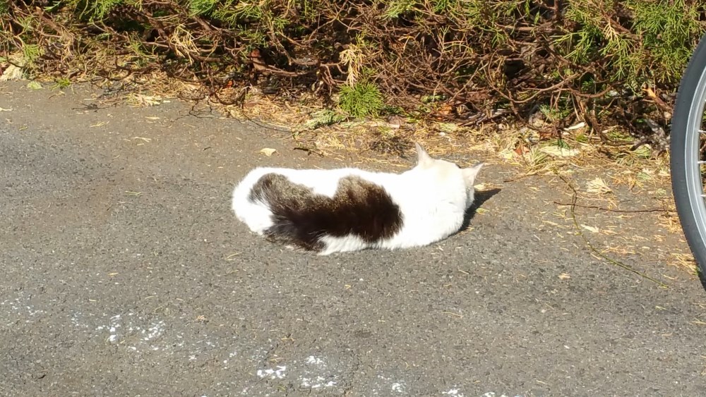 茶トラちゃんはたまにこの界隈を散歩していますが、晴れの日に必ず昼寝をするのは、この白黒ちゃんだけです。
