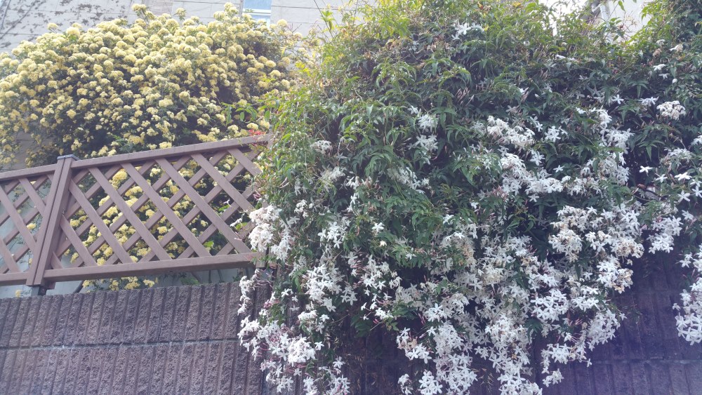 ジャスミンと木香薔薇が並んできれいに咲いているお宅です。