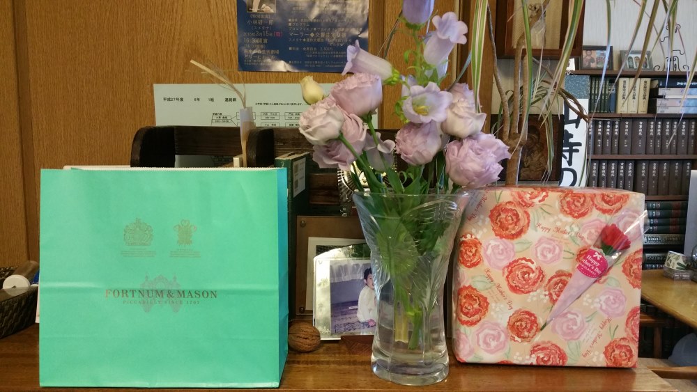 私はTシャツもあげたのですけどね、一番左が、姉からのフォートナム&メーソンの紅茶、真ん中が私からの花、右が妹からの、恐らくお菓子のギフトセットです。